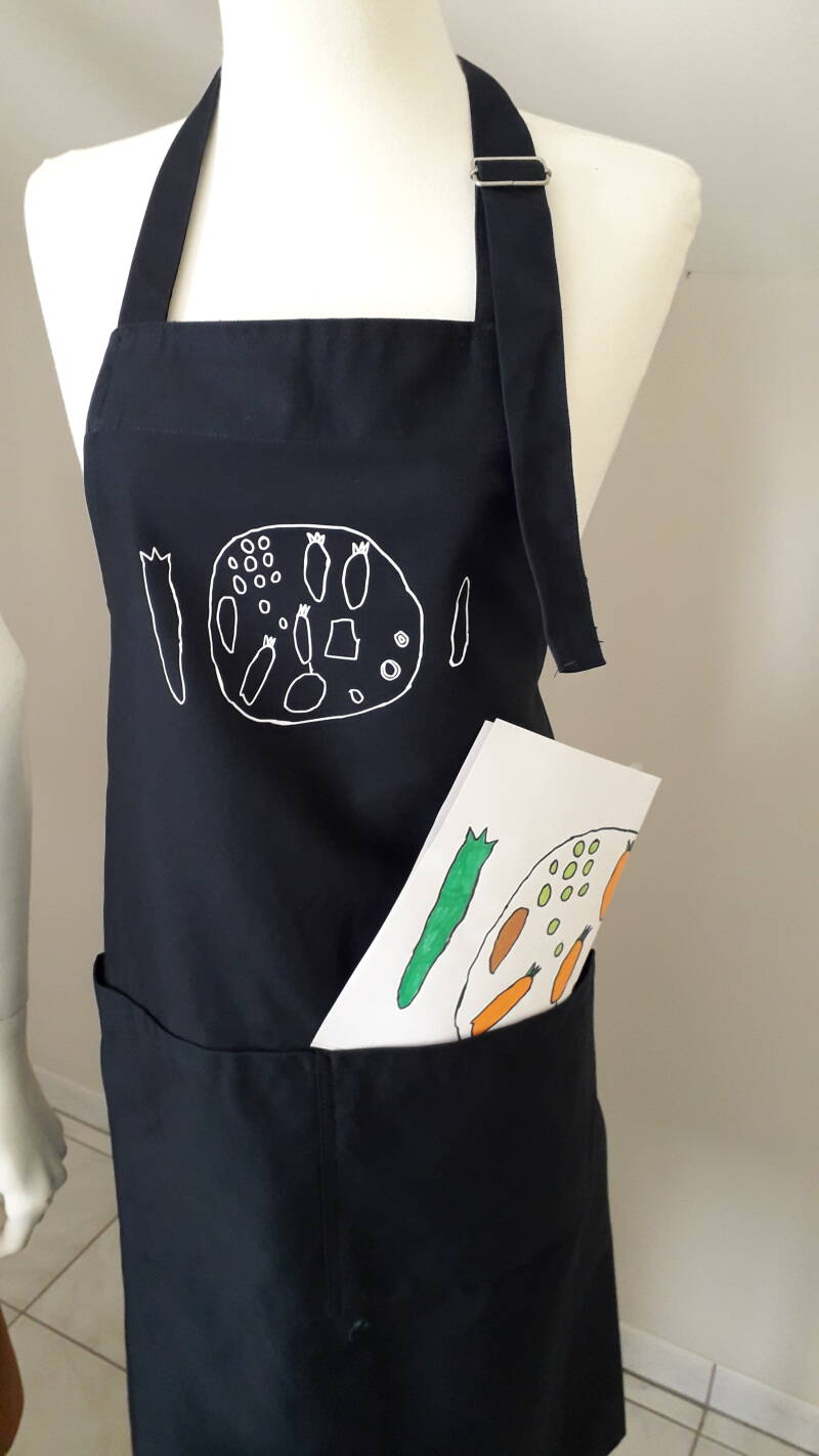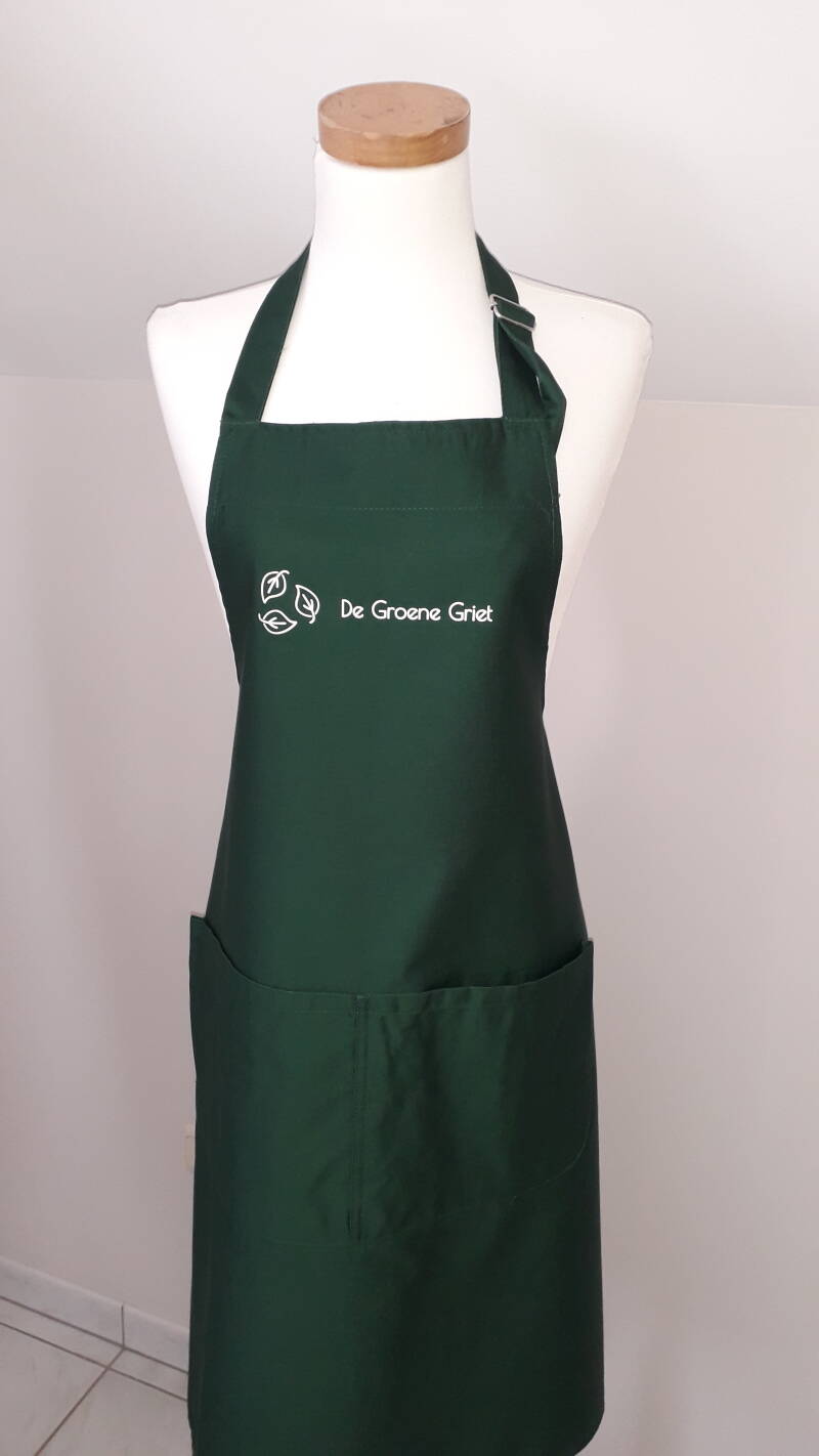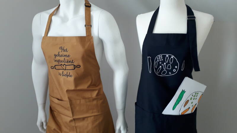 Geef de gewenst opdruk in in het vak 'opdruk'.75 x 90 cm (Breedte x Lengte)met verstelbare nekband65% Polyester / 35% Katoen