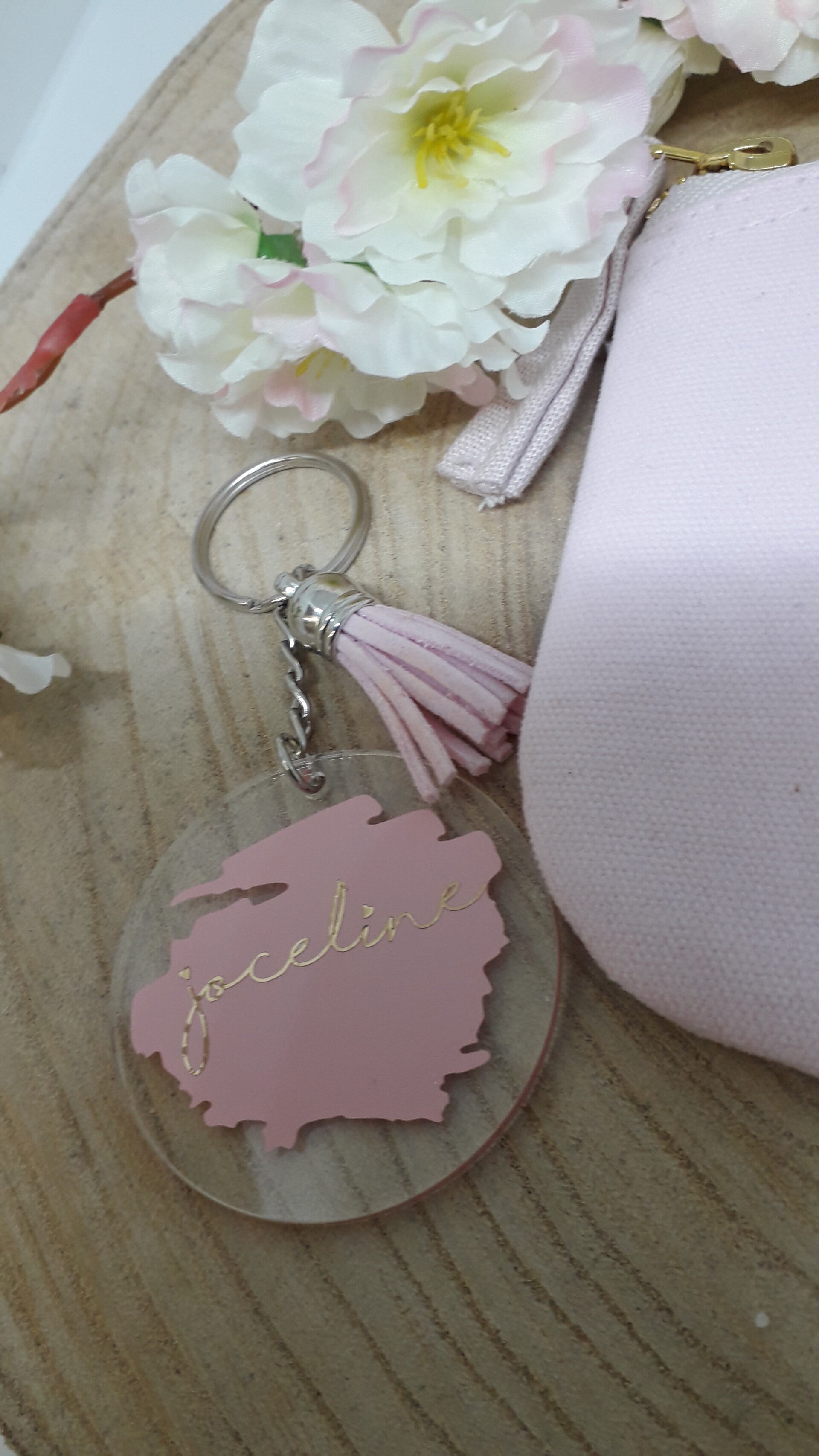 sleutelhanger in plexi (5 cm doorsnede) met kwastje in aangepaste kleur
