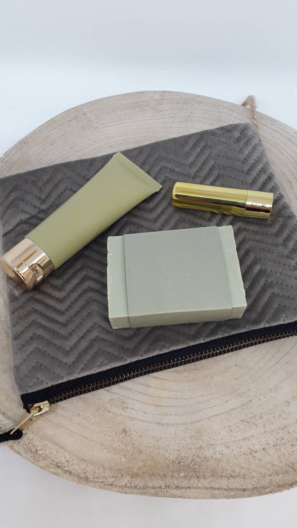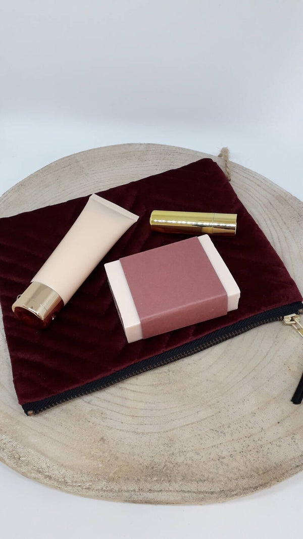 Fluweelzacht tasje met 3 verzorgingsproducten