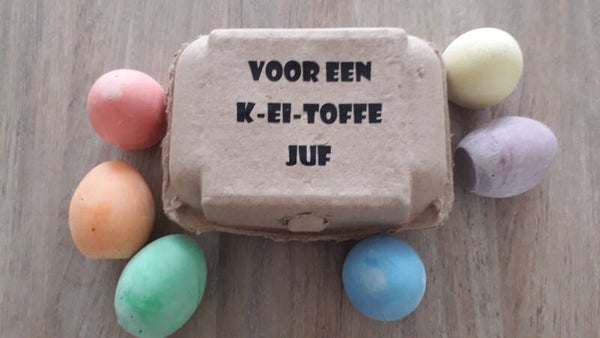 Set van 6 leuke krijteitjes in een echt kartonnen eierdoosje.