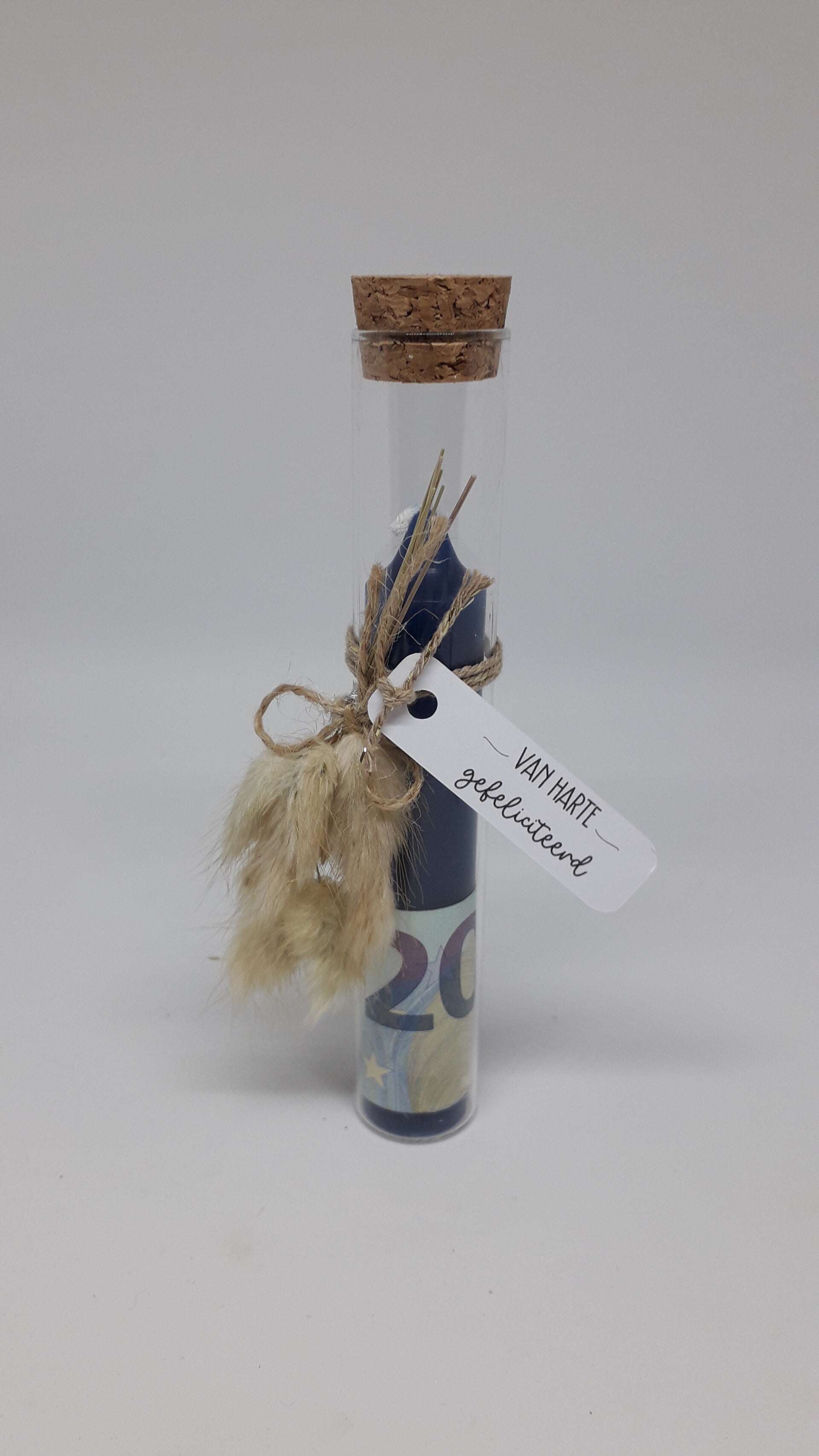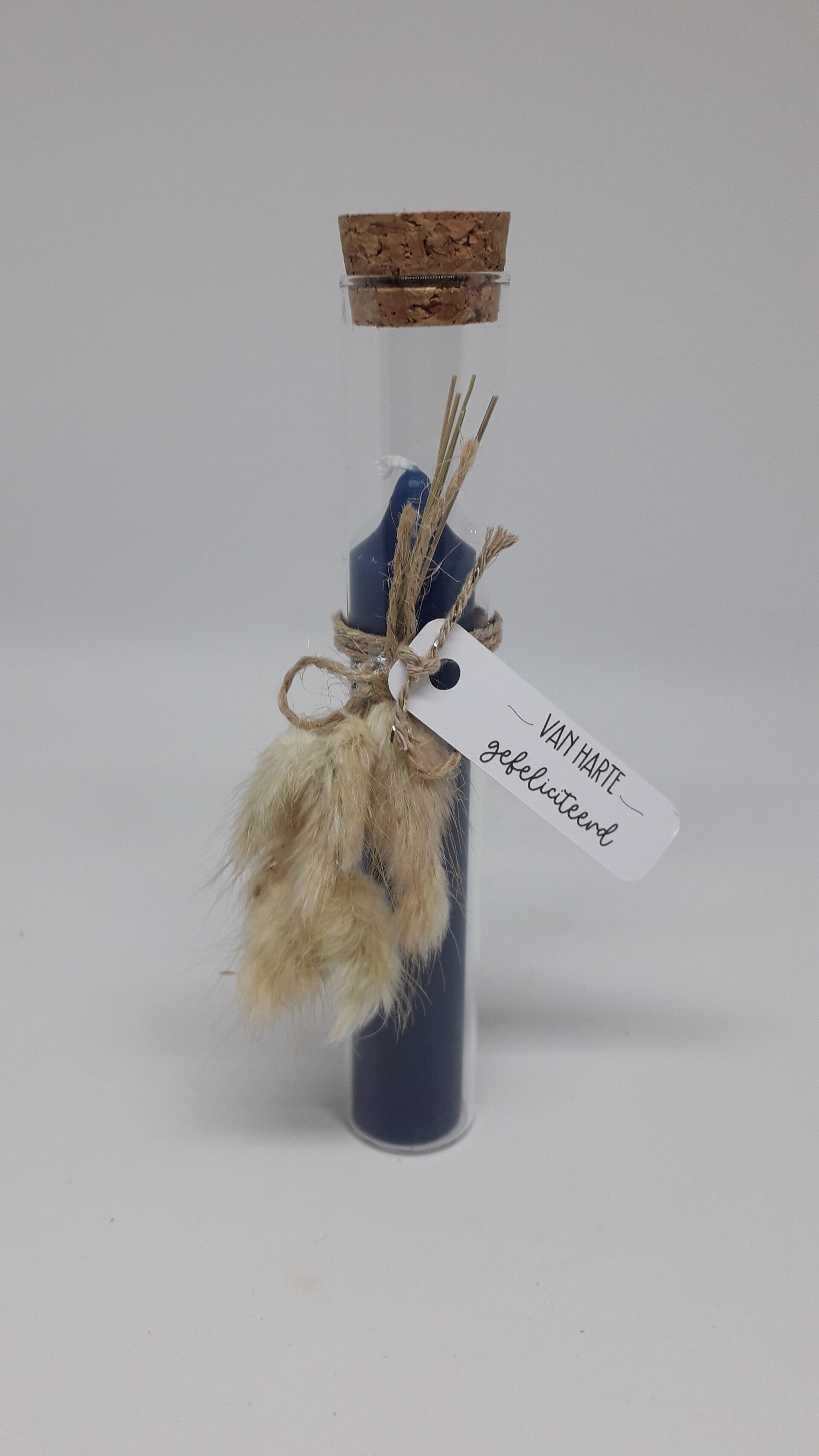Geurloos dinnerkaarsje in proefbuisje (15cm hoog), afgewerkt met droogbloemen in naturelkleur.